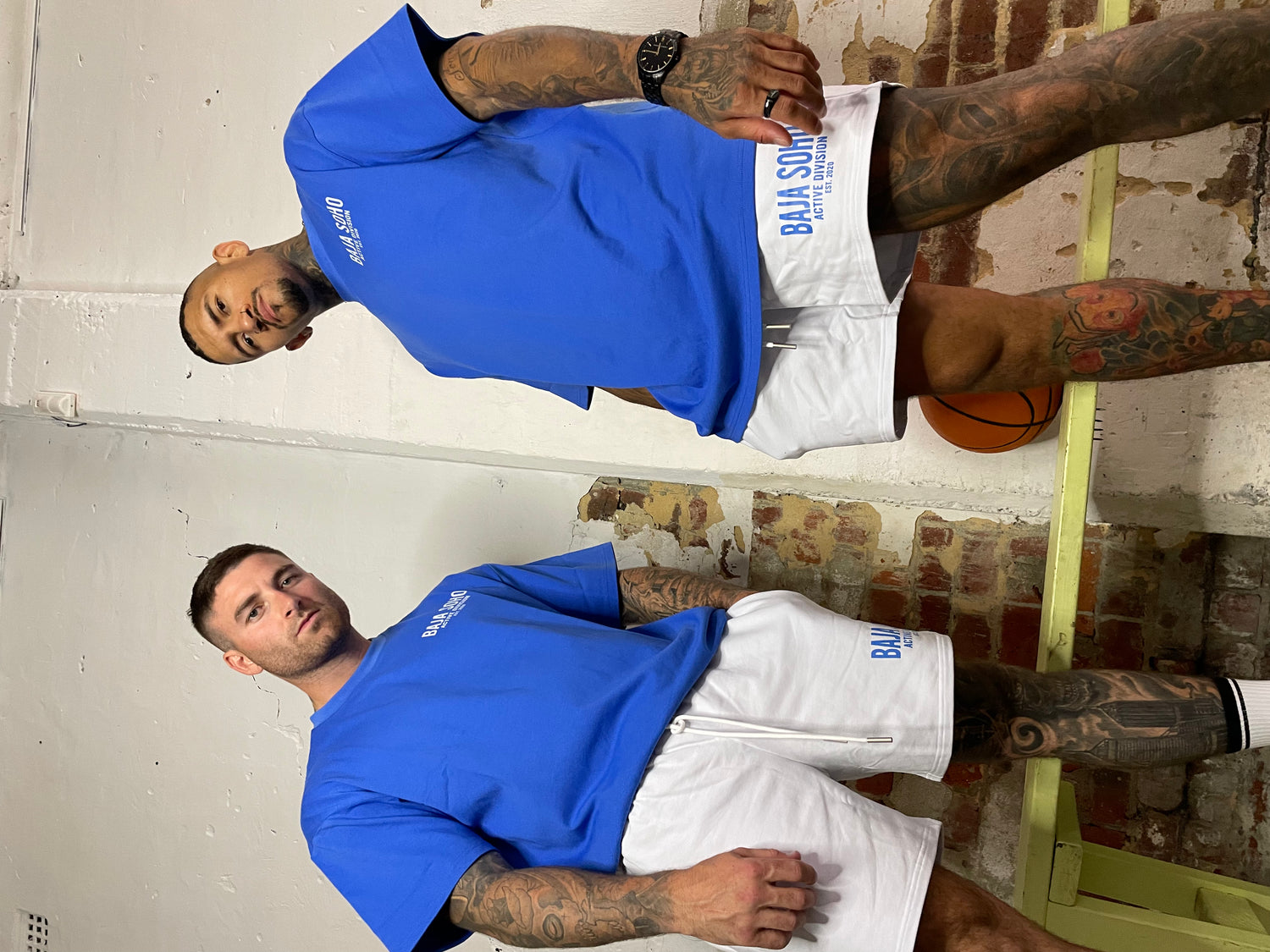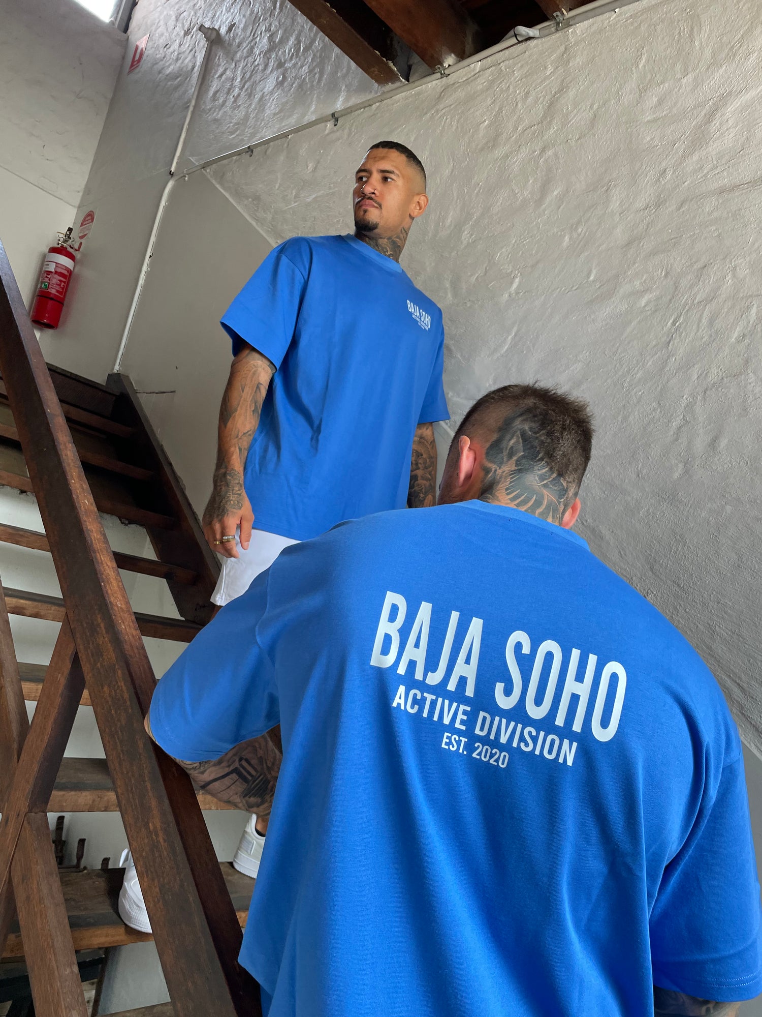 Description Blue t-shirt, with small white print on the front & large white print on the back. |