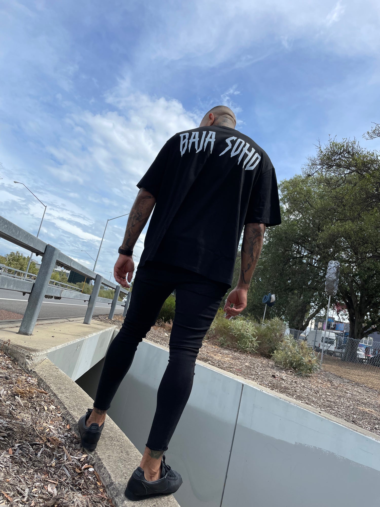 Description Black oversized t-shirt, with white logo on front and a large white back print. |